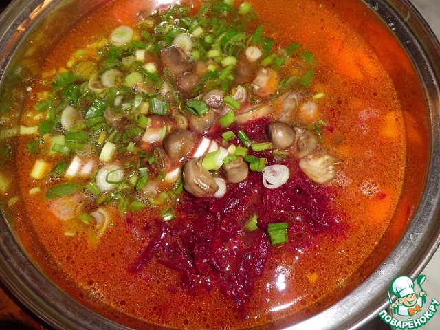 Так же отправляем в кастрюлю нарезанный зеленый лук, грибы, свеклу и мелко нарезанный чеснок, оставляем потомиться минут на 10.