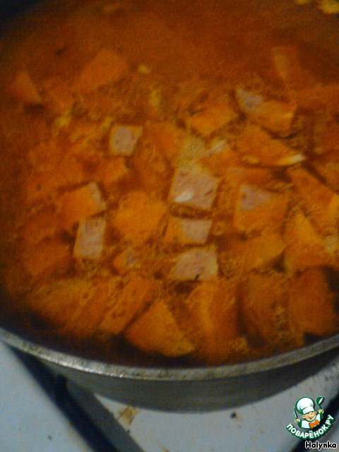 Колбасу нарезать кубиками и добавить к нашему вареву. Кто уже начал пост, сообщаю, что можно и без колбасы, и без бульона.