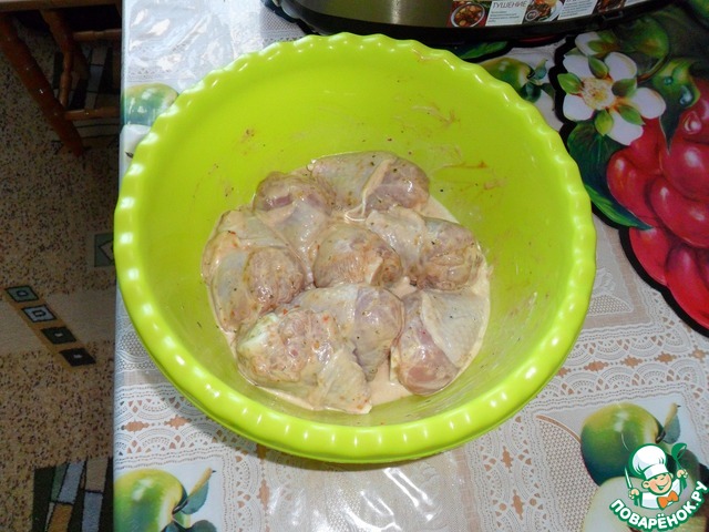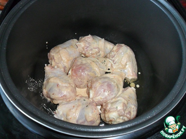 В смазанную подсолнечным маслом чашу мультиварки выкладываем замаринованную куриную голень, включаем режим выпечки на 10 минут.