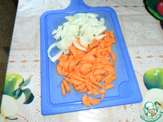 Режем крупными брусочками морковь, полукольцами репчатый.
