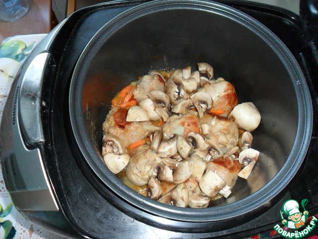 Затем добавляем овощи, грибы, порезанный чернослив, 100 мл горячей воды и включаем режим тушения на 20 минут.