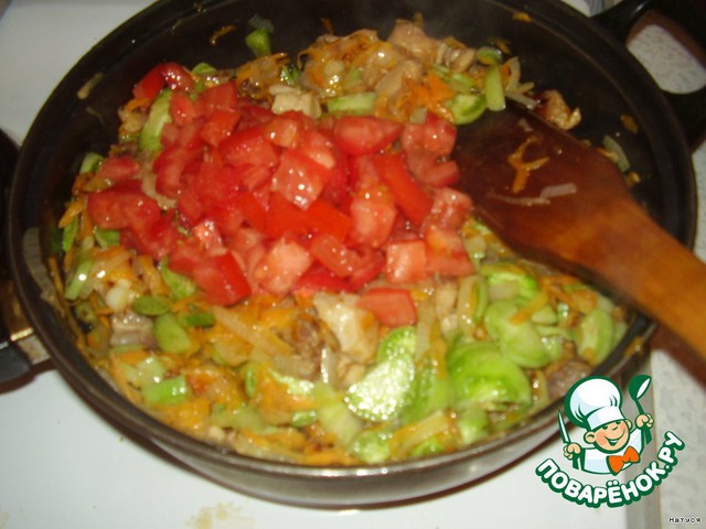 Следом отправляем в сковороду красные помидоры. Если вы любите (я не люблю) болгарский перец - самое время его положить (нарезать мелкими кубиками).
