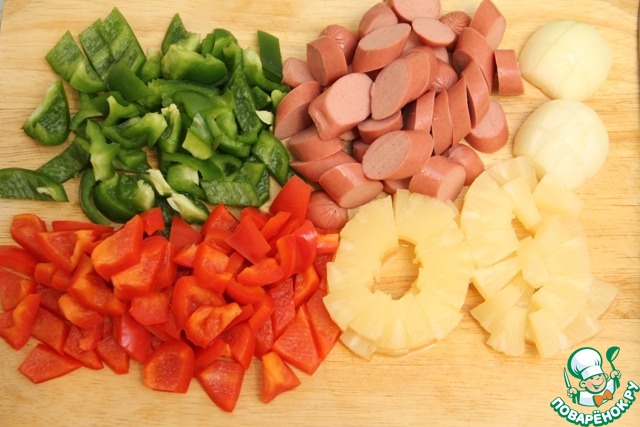 Сосиски нарезать ломтиками толщиной 1 см., болгарский перец - ромбиками, лук - полукольцами, кольца консервированного ананаса - кусочками.
