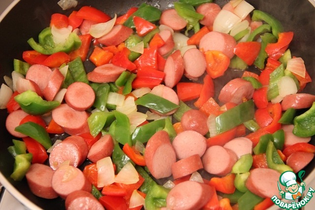Немного обжарить на оливковом масле сосиски, перец, лук.
