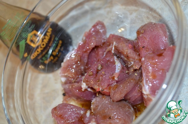 Свиную вырезку промыть, обработать от пленок, обсушить бумажным полотенцем. Нарезать на кусочки. Замариновать в соевом соусе, добавить черный молотый перец, соль по вкусу, кунжутное масло несколько капель и оливковое масло.