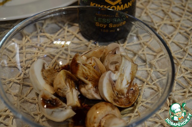 Дополнительно я взяла маленькие шампиньончики, замариновала их в соевом соусе (без соли!!!). Обжарила отдельно на гарнир.