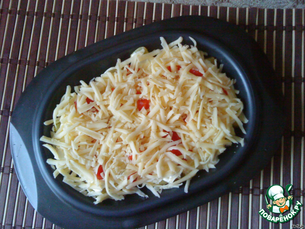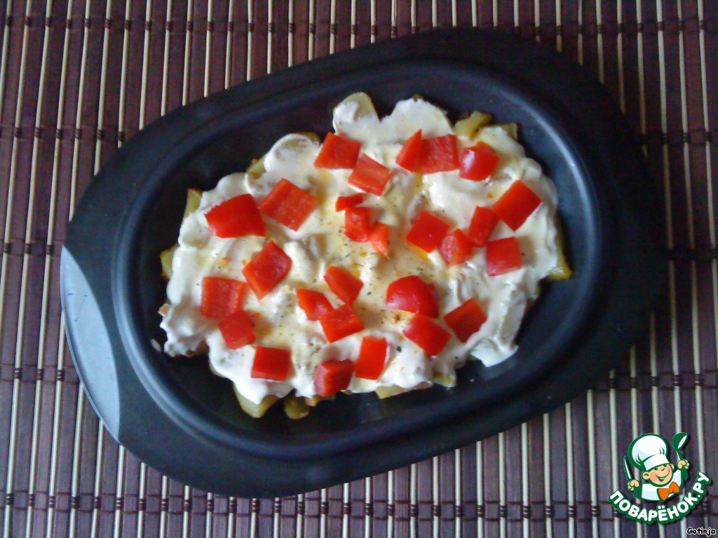 Порезать сладкий перец и выложить на картофель, промазанный сметаной.