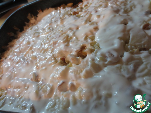 Когда рис будет готов, достать из духовки наше блюдо. Смешать с 3/4 адыгейского сыра, смазать сметанкой, посыпать оставшимся паниром.