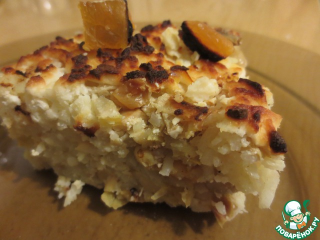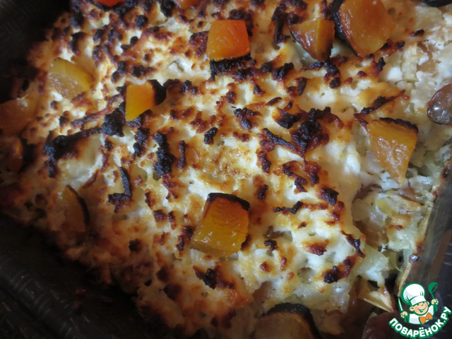 Украсить курагой, ненадолго ещё отправить в духовку.