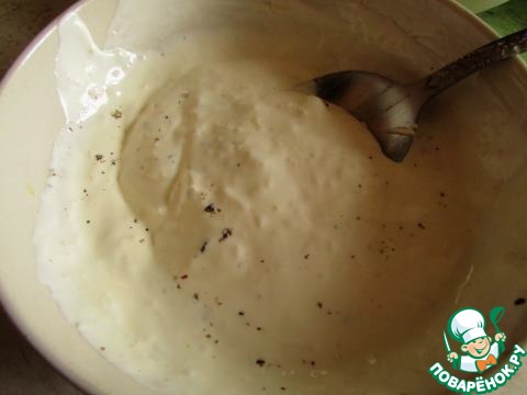 Чеснок трём на мелкой тёрке или пропускаем через чеснокодавку и смешиваем со сметаной. Туда же добавляем по вкусу соль и смесь молотых перцев.