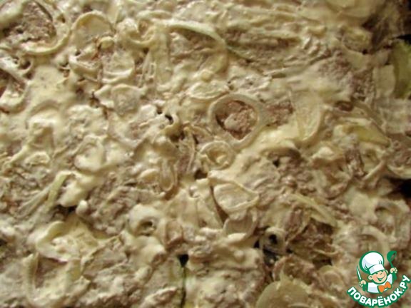 На слой из фарша выложила кольца поджаренного лука и всё это обильно полила соусом из сметанки и чесночка с перцем.