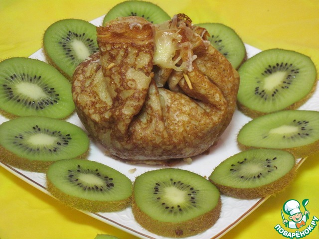 Поставим в духовку на 10 минут и при 180 градусах подрумяним, за несколько минут до готовности присыпим макушку мешочка сыром, чтобы блинчики не распадались при извлечении шпажек.