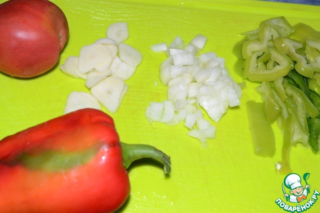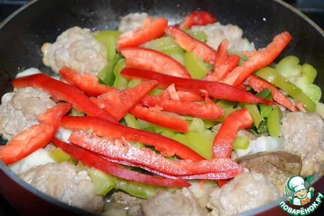Перец зеленый и красный нарезать соломкой, добавить в сковороду.