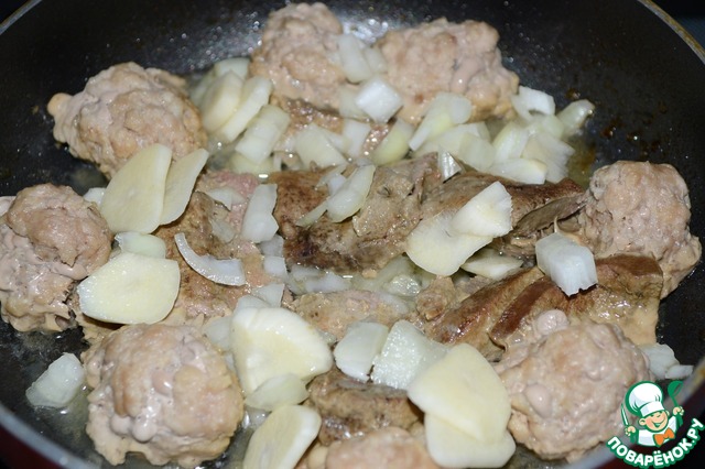 Свиной фарш посолить и слепить шарики. Печень порезать на небольшие кусочки. Разогреть на сковороде подсолнечное масло. Шарики из фарша и печень выложить на сковороду и поджарить в течении нескольких минут.