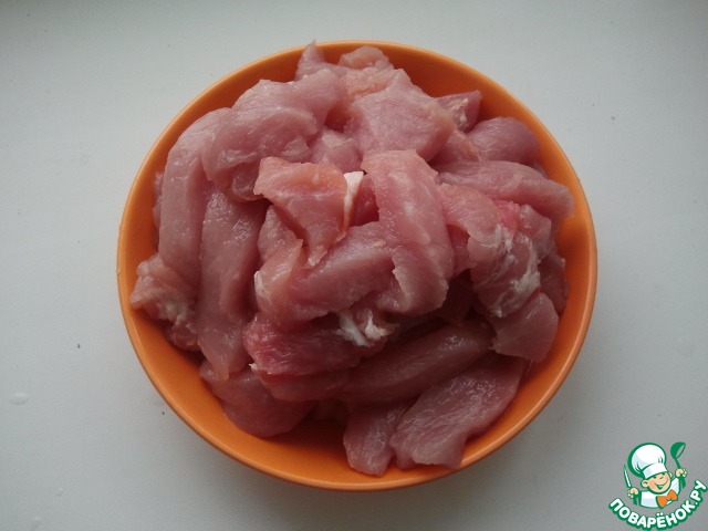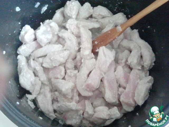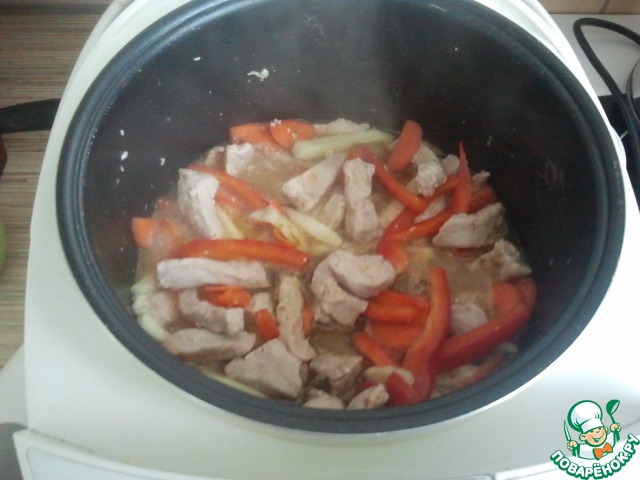 Выкладываем мясо в мультиварку и обжариваем минут 15, пока мясо не изменит цвет. Добавляем немного воды, совсем немного и ставим на программу тушение - 1 час. Ни соли, ни приправ пока не добавляем.