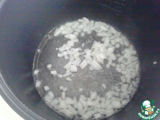 Включаем мультиварку на программу жарка, дадим разогреться. Нарезаем мелко лук и слегка обжариваем, минут пять.