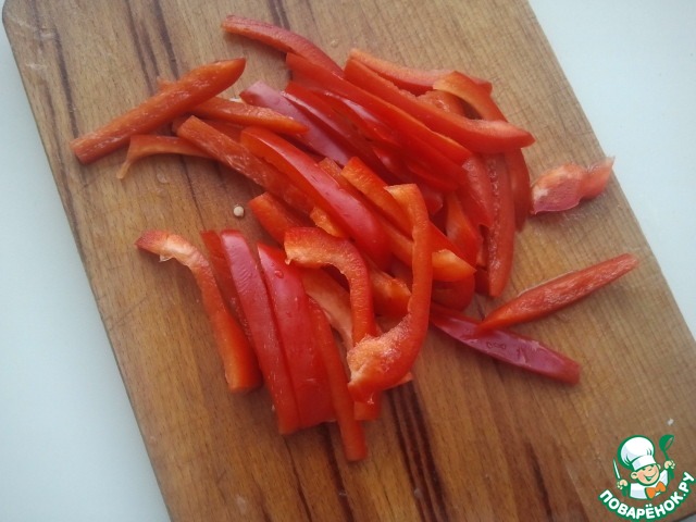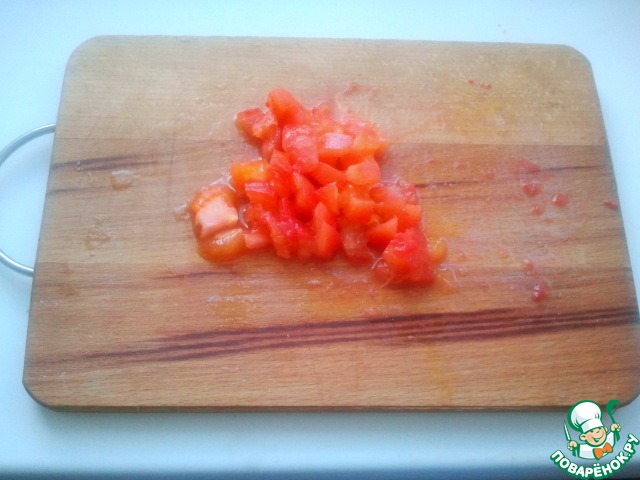 Помидор ошпарим кипятком, снимем кожицу и нарежем кубиками.