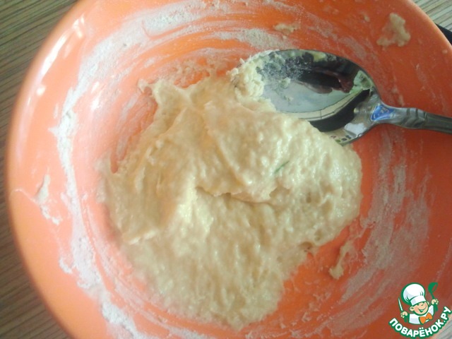 Немного посолить, совсем чуть-чуть, добавить муку и перемешать.