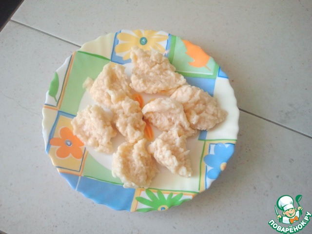 Натертый сыр добавить в тесто и хорошо перемешать. Ложкой берем небольшие порции теста и опускаем в кипящую воду. Проводим ложкой по дну кастрюли, чтобы не прилипли. Как только клецки всплыли вынимаем их выкладываем на тарелку.