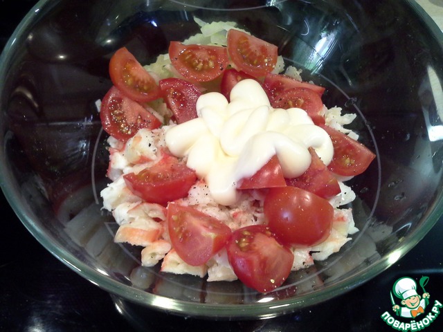 Режем кубиками мясо краба, один стебель сельдерея (тонко), помидорки на 4 части, соль перец, сок лимона, майонез. Аккуратно перемешиваем.