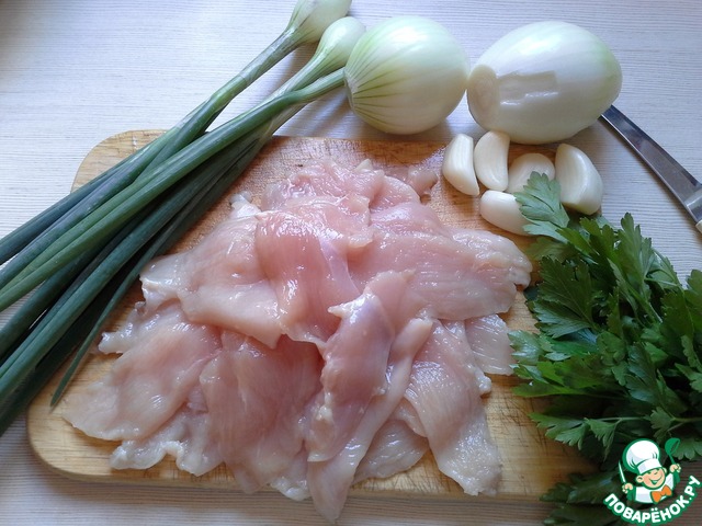 Нарезаем филе грудки как можно более тонкими ломтиками, солим, перчим. Подготавливаем лук, чеснок, зелень.