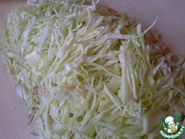Капусту тонко шинкуем. Репчатый лук нарезаем очень тонкими четвертинками колец, а чеснок - тонкими кружочками, зеленый лук и петрушку мелко рубим.