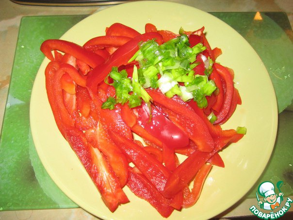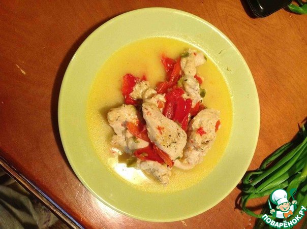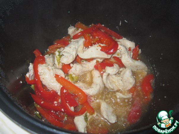 В мультиварку погружаем курицу и ставим на режим "Обычный" или "Bыпечка" на 10-15 минут, потом кладем туда перец, лук, наливаем соевый соус и стакан воды, солим, перчим и ставим еще, пока вода почти вся не выкипит.