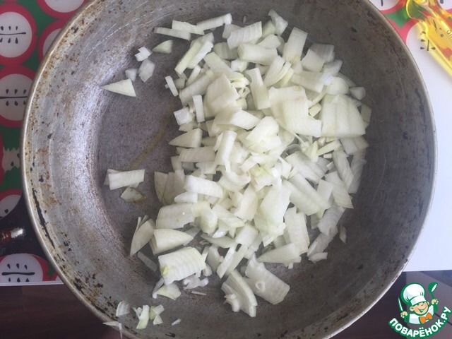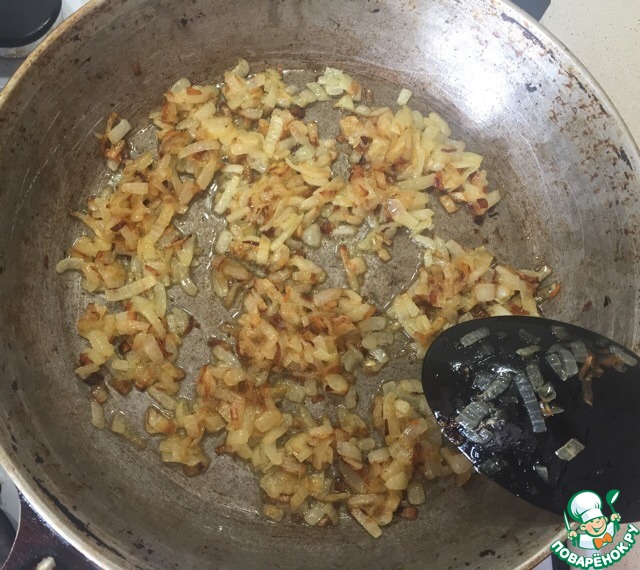 Лук жарим до золотистого цвета, добавляем к баклажанам.