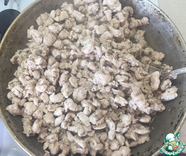 Куриную грудку жарим почти до готовности. Добавляем специи. Сюда же добавляю имбирь.