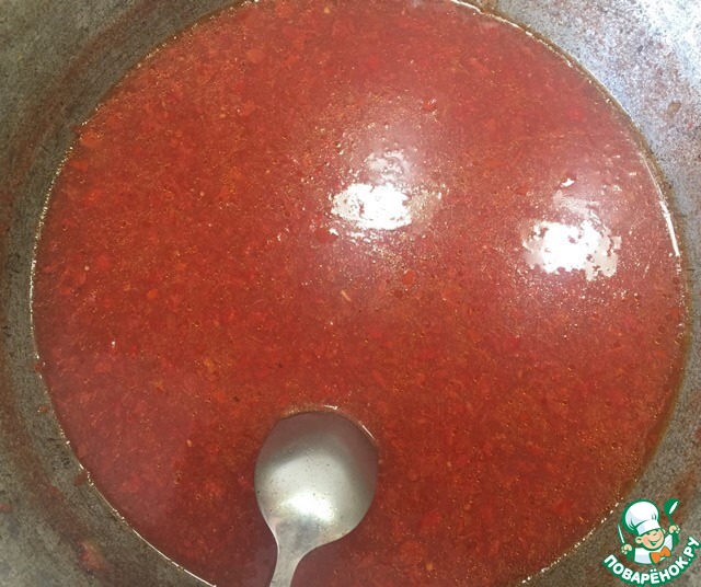 Итак, выливаю томат в сковородку, добавляю кипяченую воду, соль, чуть сахара, специи по вкусу.