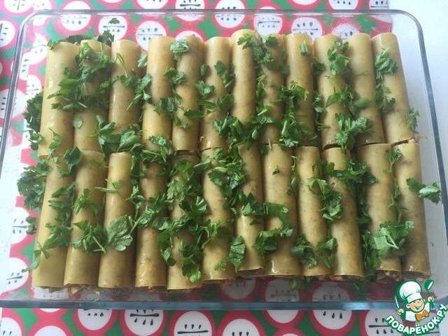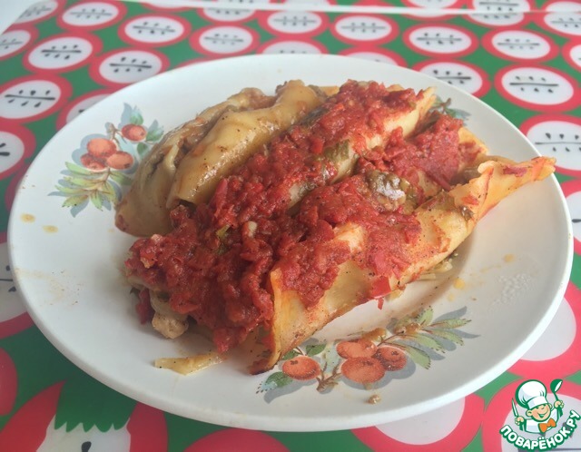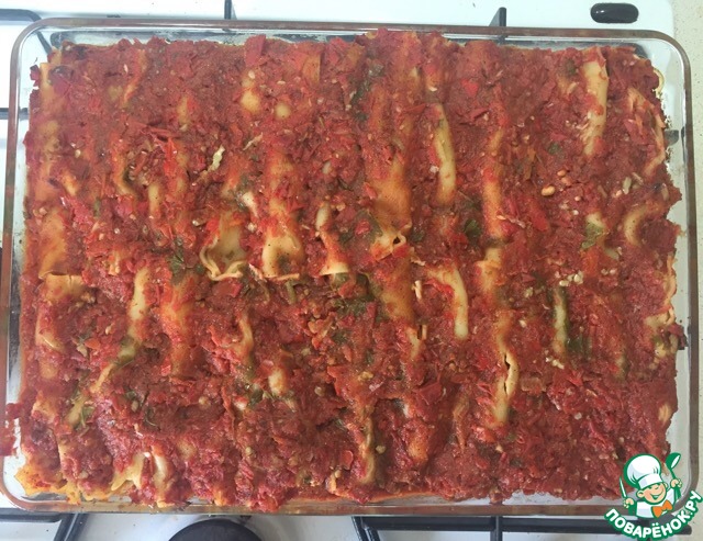 Заливаем томатным соусом. Ставим в духовку разогретую до 200-220 градусов не менее, чем на 30 мин. Готовность пасты пробуем ножом. Каннеллони должны быть мягкие.