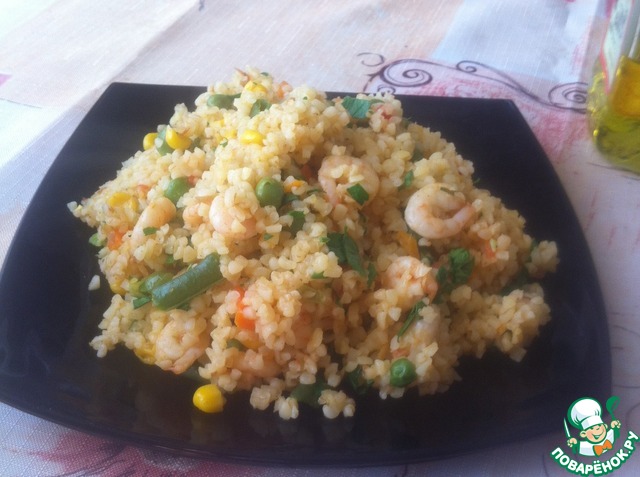 | Очень вкусное основное блюдо из пшеничной крупы булгур с добавлением креветок и овощей |