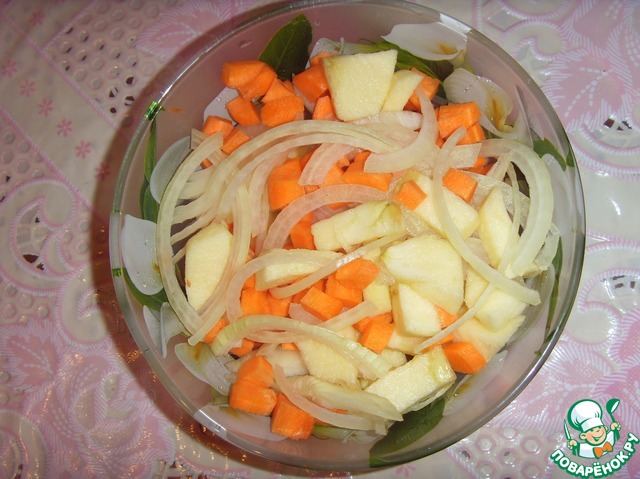 В рукав для запекания выкладываем сначала "подушку" из моркови, яблок и лука. А затем порционные кусочки птицы и лавровые листочки.