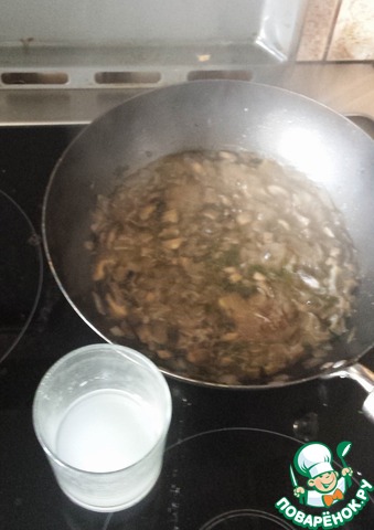 5. Добавить грибы, протушить немного, залить белым вином, оставить тушиться, пока вино не испарится