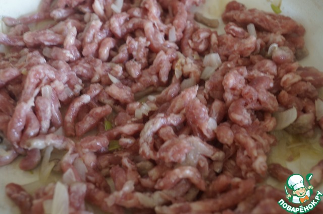 К луку добавить говяжий фарш и обжарить на сильном огне несколько минут. Огонь убавить.