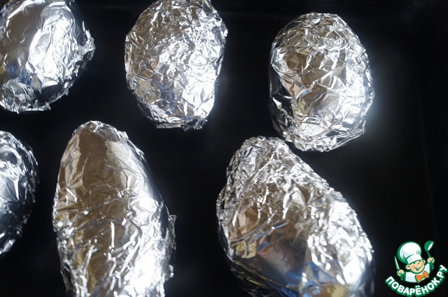 Картофель хорошо вымыть и завернуть в фольгу. Выложить картофель на противень и запечь в разогретой до 200 градусов духовке 50 минут. Готовность картошки и время ее запекания зависит от ее размера.