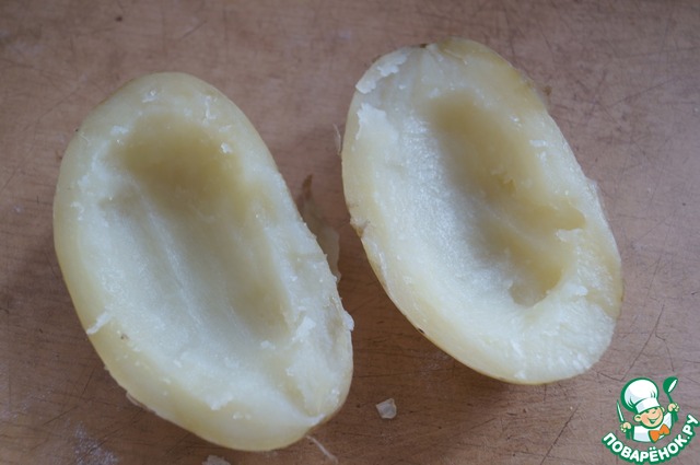 Готовый картофель развернуть из фольги, разрезать пополам и вынуть мякоть чайной ложечкой