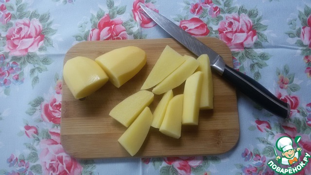 Нарезаем картофель треугольными дольками.