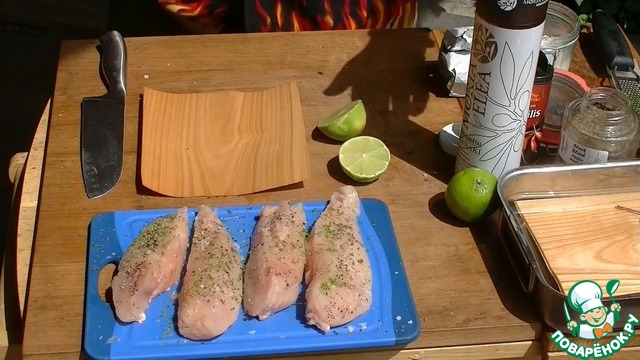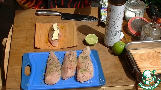 3. Смажьте гриль-бумагу оливковым маслом и положите половинку грудки на середину листа, вдоль волокон древесины. Сбрызните соком лайма, посыпьте перцем чили и положите сверху ломтики сливочного масла.