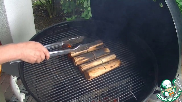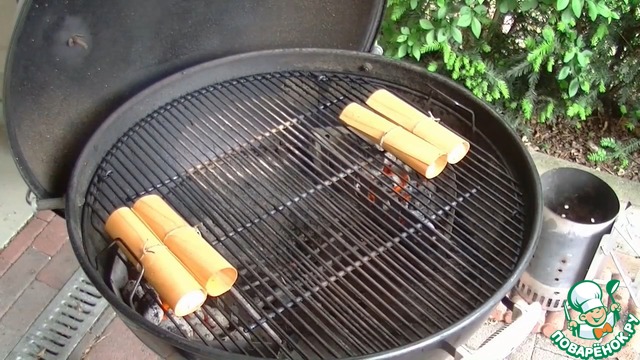 4. Свяжите рулоны влажными бечевками и поместите на решетку барбекю над открытым источником тепла, закройте крышку.