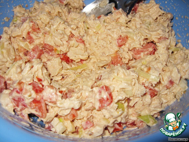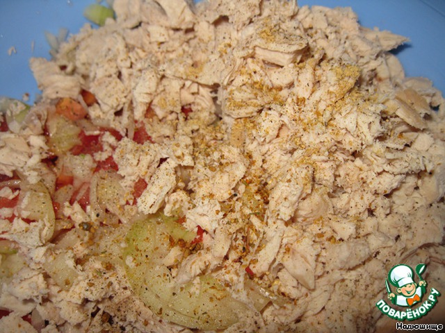 Соединяем овощи и курицу. Солим, приправляем специями.
