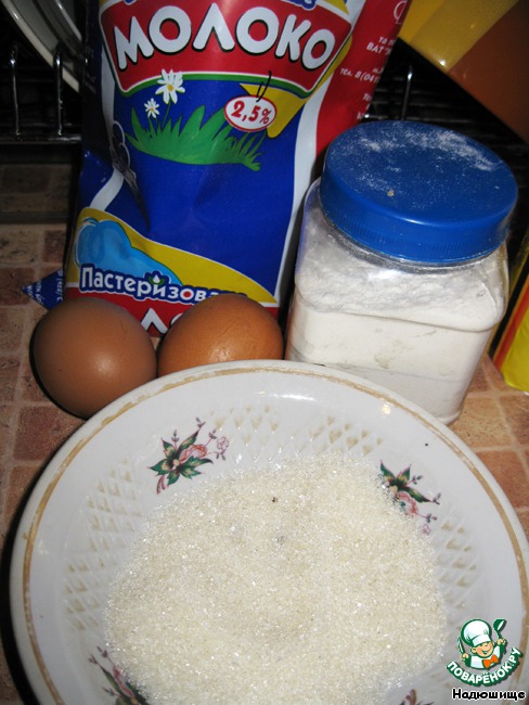 Для этого смешиваем: яйца, молоко, сахар и муку.