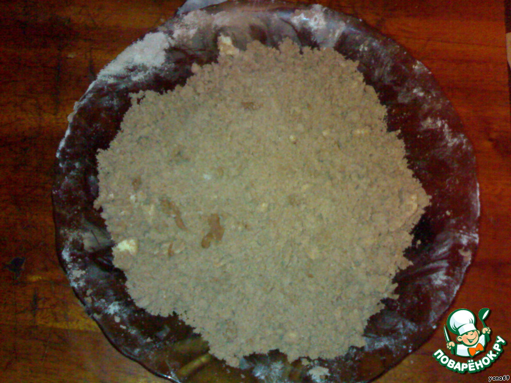 Натираем холодное сливочное масло на терке (или рубим ножом) в муку, добавляем сахар, разрыхлитель, какао и перетираем все в крошку.