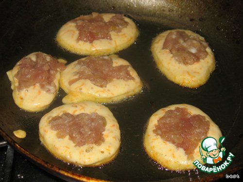 Теперь жарим оладушки, выливаем чайную ложку теста на сковороду, сверху выкладываем немного мясного фарша.