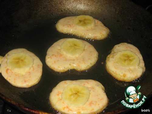 Или на тесто выкладываем колечко банана, переворачиваем и жарим как обычные оладьи.