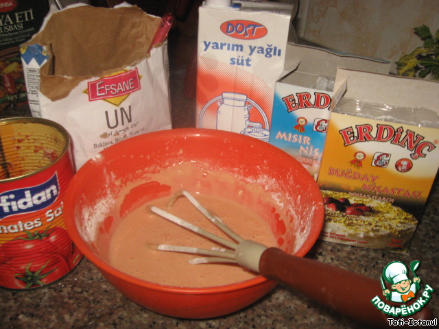 Месим тесто-молоко, мука, разрыхлитель, крахмал, чуть пасты, хотя можна и без нее. Оставить на 20 минут, хотя и сразу можно жарить.