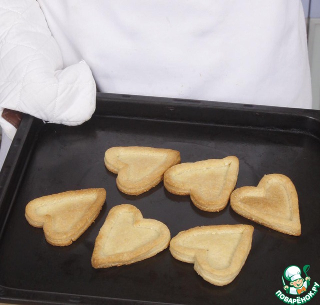 На присыпанной мукой поверхности раскатать тесто в пласт толщиной 0,3 см. Специальной формочкой вырезать из теста сердечки. Из половины получившихся сердечек аккуратно вырезать середину, оставляя края шириной 0,5 см. Одну сторону смазать слегка взбитым белком.