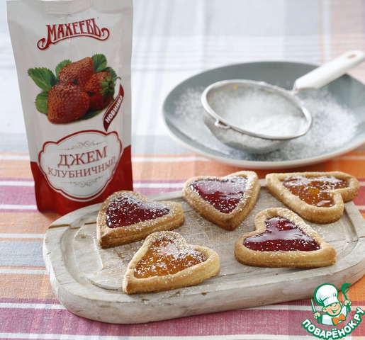 Половину остывших сердечек заполнить клубничным джемом, вторую половину - абрикосовым. Присыпать печенье сахарной пудрой.