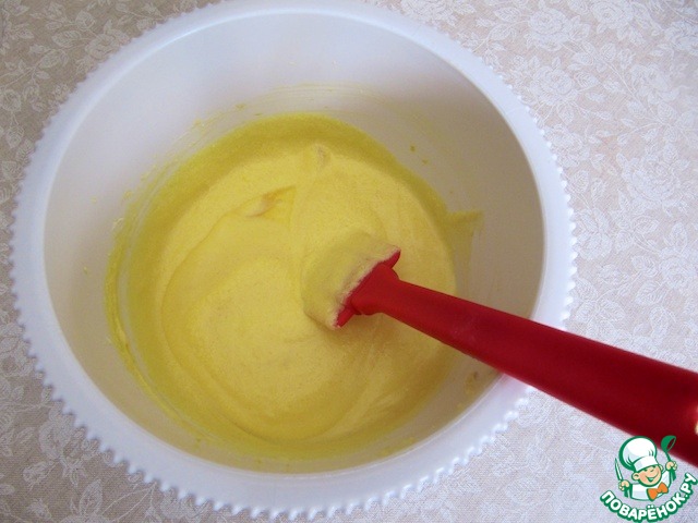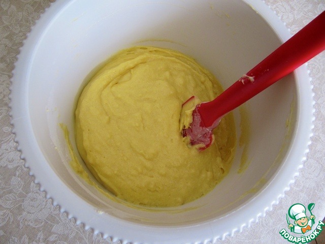 Взбить мягкое масло с сахаром и 1 яйцом, продолжая взбивание добавлять по одному все яйца. Взбивать до пышной массы.