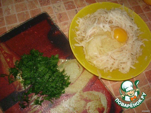 Пока тесто поднимается, картошку натереть на крупной тёрке, добавить яйцо, зелень порезать.